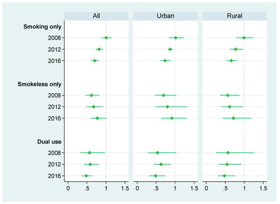 In line with the trends observed since 2008, the adjusted relative risk ratios (ARRR) for consuming any form of tobacco and for smoking including dual use decreased, while the ARRR for consuming only smokeless tobacco increased (Figure 2). The ARRR for consuming smoking only tobacco gradually decreases from 1.00 in 2008 to 0.70 in 2016, and the ARRR for consuming smokeless only tobacco increases from 0.62 in 2008 to 0.77 in 2016. The ARRR for dual use of smoked and smokeless tobacco products declines from 0.57 in 2008 to 0.48 in 2016. The patterns are also similar for urban and rural sub-samples.