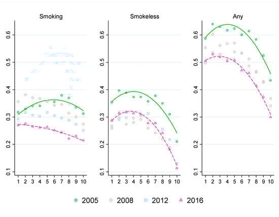 The quadratic fit line for smoking tobacco in 2005 is concave shaped, which suggests that smoking tobacco consumption gradually increased as wealth increased at lower deciles (i.e., poorer households) and gradually decreased as wealth increased at higher deciles (i.e., richer households). This concave relationship pattern changed to a downward sloping line in 2016 demonstrating a clear negative association between smoking tobacco consumption and household wealth. This shift in the pattern of smoking by household economic status was driven by increases in smoking prevalence between 2005 and 2008 followed by decreases between 2008 and 2016 in the lower five deciles, while the upper five deciles experienced continuous decline throughout 2005–2016. Overall, between 2005 and 2016, the prevalence of smoking decreased by only 5 to 7 percentage points for the poor households (bottom 3 deciles), whereas it decreased by 8 to 14 percentage points for the middle-income households (4 middle deciles) and 10 to 15 percentage points for the rich households (top 3 deciles).