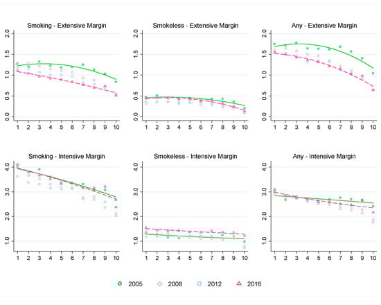 At the intensive margin, average expenditure share of smoking tobacco increased by 0.1 percentage points for the bottom 2 deciles, whereas it decreased by 0.3 percentage points for the top decile. For smokeless tobacco, average expenditure share increased by 0.1 to 0.3 percentage points across all deciles. Average expenditure share of any tobacco at the intensive margin increased by 0.1 to 0.2 percentage points for the bottom 2 deciles and decreased or remained unchanged for all other deciles. As a result, the quadratic fit lines for 2005 and 2016 for smoking tobacco almost coincided, suggesting very little change over time. On the other hand, the quadratic fit line for smokeless tobacco almost parallelly shifted upward from 2005 to 2016. For any tobacco, average expenditure share increased at lower deciles (i.e., for poor households) and gradually decreased at higher deciles (i.e., for richer households) from 2005 to 2016.