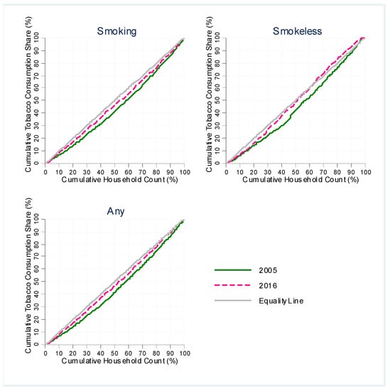 The concentration curve shifted upward for smoking, smokeless, and any tobacco, suggesting “increasing equality” in tobacco expenditure across household income strata, which is a misnomer for “increasing burden” of tobacco consumption on the poor (Figure 5). To put it more formally, lower-income households were bearing greater burden of tobacco expenditure share in 2016, compared to that in 2005. In 2005, the bottom 30% (poor households) bore 22.8% of the total tobacco (i.e., any tobacco) expenditure of all households, which increased to 26.7% in 2016.