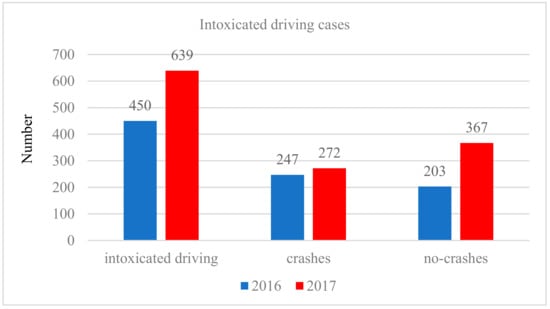 Wujiang is administratively affiliated with Suzhou, China, and has a population of approximately 830,000 (the female population is approximately 410,000 and the male population is 430,000); the number of motor vehicles was more than 360,000, and the per capita GDP reached 73,106 RMB (11,623 USD) in 2017 []. An analysis of Wujiang may be representative among similar-level cities of China. First, the population, economic strength and vehicle numbers of Wujiang rank among the top ten in the same-sized cities of China, so alcohol-involved driving may be relatively prominent. Second, Wujiang has a high floating population. The large floating population may cover all levels of Chinese society, which makes the related factors such as occupation and education more representative. The damage caused by intoxicated driving is larger than that caused by common alcohol-involved driving, since it seriously affects drivers’ driving, as well as threatens the safety of other road users—that is why Chinese law regards this behavior as a criminal offence. Figure 1 depicts the statistics of intoxicated driving of Wujiang for the years of 2016 and 2017, and the traffic crash rates caused by intoxicated driving in 2016 and 2017 were 54.89 and 42.57%, respectively.
