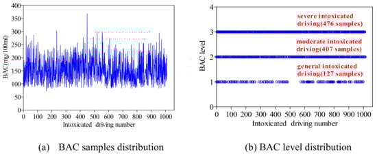 Because BAC in this study is all above 80 mg/100 mL (i.e., the intoxicated driving), it is classified as three levels in this study: 80 mg/100 mL–100 mg/100 mL (i.e., it is level 1, which is defined as the general intoxicated driving), 100 mg/100 mL–150 mg/100 mL (i.e., level 2, and it is defined as the moderate intoxicated driving), and above 150 mg/100 mL (i.e., level 3, and it is defined as the severe intoxicated driving). In the general intoxicated driving, moderate intoxicated driving and severe intoxicated driving groups are 127, 407, and 476 samples, respectively (see Figure 2). The compulsory measure is primarily detention—“yes” and “no” represent detention and no-detention, respectively.