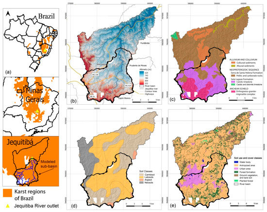 (a) Location of study area: Jequitiba River basin, Minas Gerais, Brazil; (b) topographic map of Jequitiba River basin, with indication of towns, drainage network, and main road network; (c) lithologic map of the Jequitiba River basin; (d) soil map of the Jequitiba River basin; (e) land use and cover map of the Jequitiba River basin; The geographic reference for the maps is the UTM projection system, SIRGAS 2000 datum, 23 south time zone.