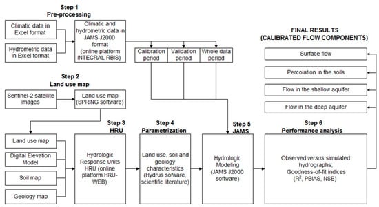 The hydrologic modeling was developed in six main steps (Figure 2): (1) pre-processing of climatic and stream flow data. The data records comprised the 2003–2016 period; (2) mapping of land use and occupation; (3) design of homogeneous hydrologic response units in the area; (4) parameterization of input data; (5) hydrologic modeling based on the JAMS J2000 framework within the calibration (2003–2011), validation (2012–2016) and whole data (2003–2016) periods. The whole data period (14 years) was defined on the basis of available data. Within this period, a larger time span (9 years) was ascribed to the calibration period to allow improved hydrologic parameters, while the time window for validation was restricted to the remaining 5 years; (6) performance analysis of calibrated models based on comparisons between observed and simulated hydrographs as well as in goodness-of-fit indices.