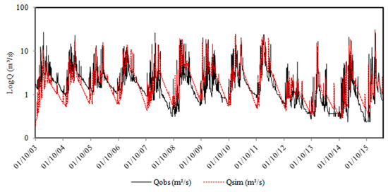 The relationship between observed and simulated flows in the 2003–2016 period is illustrated in Figure 3. The simulated hydrograph is very similar to the observed hydrograph. The simulated maximum, mean, and minimum flows were: 30.8 m3 s−1, 2.34 m3 s−1, and 0.19 m3 s−1, respectively. These results were close to the observed flows, which were 28.2 m3/s (maximum), 2.26 m3/s (average), and 0.24 m3/s (minimum). The results of model performance are displayed in Table 6. Whole period values of PBIAS indicate a very good performance while NSE values indicate a good/fair level. Overall, a good performance can be assumed.