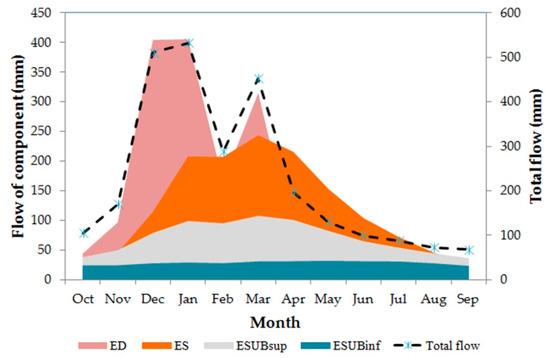 Seasonal distribution of total flow and of stream flow components estimated by the hydrological model. Symbols: ED—surface flow (overland flow due to sealing or saturation excess), ES—fast interflow (percolation within the upper soil layer); ESUBsup—fast baseflow (usually from the weathering part or fissures if existing); ESUPinf—base flow from base rock. Total flow = ED + ESUBsup + ESUBinf. The values represented in mm were calculated as amount of flow (m3) divided by HRU area (m2).