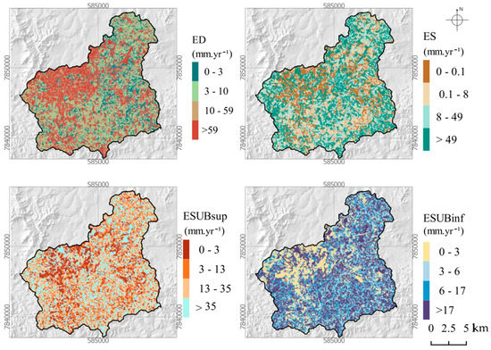 Spatial distribution of stream flow components estimated by the hydrological model. Symbols: ED—surface flow (overland flow due to sealing or saturation excess), ES—fast interflow (percolation within the upper soil layer); ESUBsup—fast baseflow (usually from the weathering part or fissures if existing); ESUPinf—base flow from base rock.