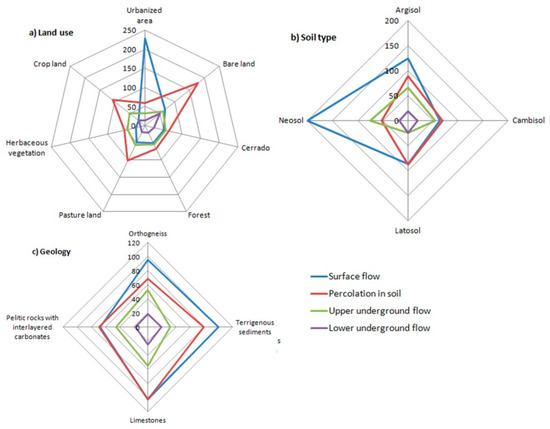 A cross tabulation of Figure 5 with the land use, soil, and geology maps allowed the quantification of flow components within the corresponding soil, land use, and geology types. The results are portrayed in Figure 6. The conclusion taken from the observation of Figure 5 is clearly demonstrated in Figure 6a where surface flows dominate in the urbanized areas and reach 228 mm every year, on average. Urbanization reduced substantially the shallow groundwater flow, which is 54 ± 5 mm for all land uses except the urban use where it is just 60% of that value (32 mm). The low topographic relief in the urban areas may also help to explain these values since there are less hilly areas in the city as compared to the hills in the southeast of the basin. Bare land has the largest flow in the soil, but this land use type is represented in just a small portion within the sub-basin headwaters (see Figure 1e). For the other more represented land use types, the annual percolation in the soil is larger in the areas used for agriculture (107 mm) and pasture (102 mm), represented as antropized areas in Figure 1e, and lower in the planted (67 mm) and native vegetated (Cerrado; 65 mm) areas. It should be noted, however, that the areas used for agriculture or pasture are usually located where relief is flat or smoothly undulating, favoring infiltration, while forests are frequently planted in sloping hillsides to protect soil from water erosion and native vegetation is widespread along the water courses, in areas where the steeper slopes do not favor infiltration and hence soil percolation. The most represented soil types (latosols and cambisols; see Figure 1d) distribute differently the flow components: every year, on average, the areas covered by latosols contribute strongly to surface flow (87 mm) and percolation in soil (88 mm), but little to shallow (25 mm) and deep (11 mm) groundwater flow, the cambisols contribute less to the first two components (64 mm for surface flow and 69 mm for percolation in the soil) but much more to the shallow groundwater flow (55 mm) and more to the deep groundwater flow (20 mm). Flow in the various lithologic units is similar, decreasing from surface flow (91.4 ± 15.9 mm), to percolation in soil (79.8 ± 15.7 mm), to shallow groundwater flow (46.3 ± 10.3 mm), and finally to deep groundwater flow (46.3 ± 10.3 mm). There are, however, some points to refer to. Percolation in soil is substantially larger in the limestones (102 mm) than in the other lithologic types (72.4 ± 6.0 mm). The other underground components are also larger in the limestones (55 mm for the shallow groundwater flow and 20 mm for the deep groundwater flow), although the differences to the other geologic units are smaller (43.4 ± 10.5 mm and 18.5 ± 0.9 mm, respectively).