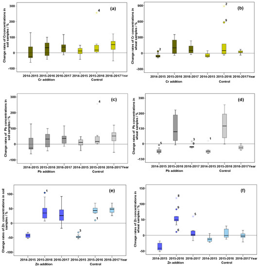 Change rates of Cr, Pb, and Zn concentrations in the soil-wheat system from 2014 to 2015, 2015 to 2016, and 2016 to 2017: (a) Cr in soil; (b) Cr in wheat; (c) Pb in soil; (d) Pb in wheat; (e) Zn in soil; and (f) Zn in wheat. For the addition sites and control site, Cr concentrations are expressed by dark yellow and light yellow, Pb concentrations are expressed by dark gray and light gray, and Zn concentrations are expressed by dark blue and light blue. Circles and asterisks with numbers are samples with outliers.