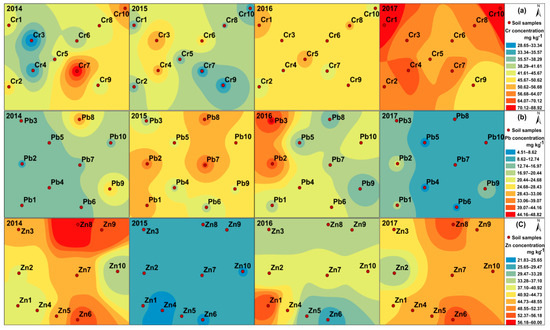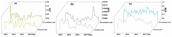 Spatial distributions of heavy metal concentrations in soil from 2014 to 2017: (a) Cr addition site; (b) Pb addition site; and (c) Zn addition site.