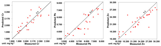 Predicted and measured values of Cr, Pb, and Zn concentrations in wheat in Liuxin mining area.