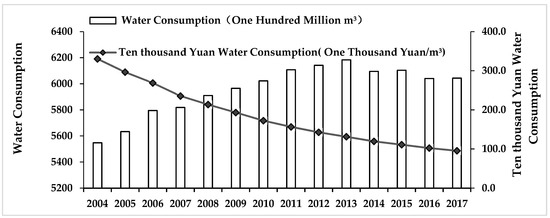 The total amount of water consumption and ten thousand Yuan water consumption of mainland China during 2004–2017.