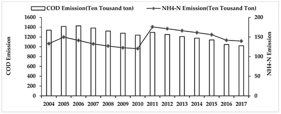 The total amount emissions of the COD and NH4-N in mainland China from 2004 to 2017.