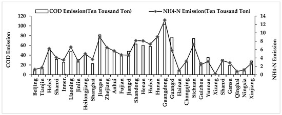 The average value of COD emissions and NH4-N emissions in each province of mainland China from 2004 to 2017.