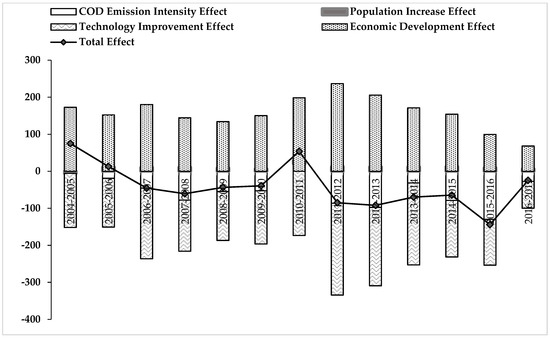 By conducting a time series of LMDI decomposition analysis, the driving factors for point source pollutants in mainland China have been quantified. Figure 5 and Figure 6 present the decomposition analysis results of point source pollution of COD and NH4-N emissions in China from 2004 to 2017, in which it is clear that the total effect of the emissions showed a downwards trend.