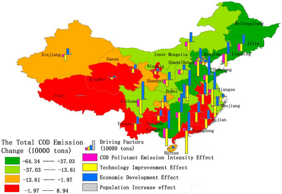 The distribution of COD emissions and contribution of each decomposition driving factor in mainland China from 2004 to 2017.