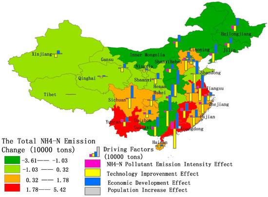 Figure 8 shows the state of point source NH4-N emission effects in mainland China. Sixteen provinces and municipalities have negative values, indicating the net total effect of the positive and negative reinforcing factors have resulted in a decrease in pollutant emissions. The rest of the provinces have positive values, which indicates that NH4-N emission curbing efforts need to be strengthened. The top three provinces and municipalities with the largest drop in emissions are Henan, Guangxi, and Liaoning, while the three provinces and municipalities with the smallest emission declines are Guangdong, Jiangsu, and Jiangxi. The result is similar to the total effect of COD emissions as mentioned above. Guangxi, Liaoning, and Jiangxi enjoy nearly the same rank in the total effect of COD discharge and NH4-N emissions. Meanwhile, Guangdong ranked fourth from the bottom in net total COD emissions, while Henan ranked fourth. Therefore, Guangxi, Liaoning, Jiangxi, Guangdong and Henan have similar characteristics in COD discharge and NH4-N emission effects. Interestingly, the total effect of COD emission in Jiangsu is −15.65, whereas that of NH4-N is 3.01. This shows that although Jiangsu has strengthened the treatment of point source pollution and achieved results in COD pollution, the treatment of NH4-N emission is still insufficient. NH4-N, mainly coming from synthetic fertilizers, will reduce the concentration of dissolved oxygen in the water, leading to a decline in water quality and the death of aquatic plants and animals [54]. Jiangsu, as the province of thousands of lakes and rivers, needs to strengthen NH4-N pollution controls to protect the aquatic environment [55].