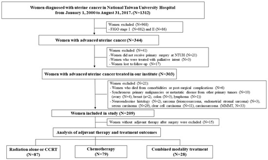 The medical records of women diagnosed with stage III/IV endometrioid endometrial cancer at National Taiwan University Hospital between January 1, 2000 and August 31, 2017 were retrospectively reviewed. The study protocol was approved by the Institutional Review Boards of our institute. The exclusion criteria were non-endometrioid histology or mixed histology types; stage I or II disease; primary surgery or postoperative adjuvant administered at other institutes; CT or RT given before the operation; and surgery or treatments given with a palliative intent. Patients with synchronous primary malignancies were excluded (Figure 1). The histologic tumor grade was determined based on tumor architecture and the nuclear grading system recommended by FIGO [5]. We divided grades into two categories—grade 1/2 and grade 3—according to previous literature [21].