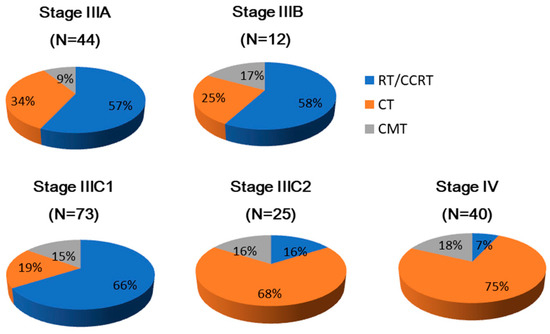 Distribution of adjuvant therapies. The number of patients in each stage is indicated in parentheses. The labels displayed in each chart represent the percentages of patients who received the different adjuvant therapies.