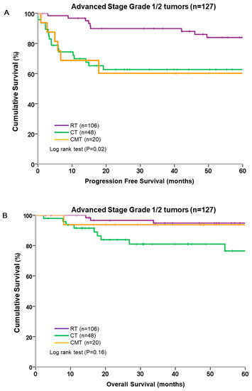 We analyzed the survival of patients with grade 1/2 tumors stratified by adjuvant therapy. Grade 1/2 tumors treated with RT alone were associated with significantly better PFS than those treated with CT or CMT (p = 0.02, log-rank test; Figure 4A). However, OS did not differ significantly between the three adjuvant therapy groups (p = 0.16, log-rank test; Figure 4B). Notably, more than half the patients in grade 1/2 did not experience disease relapse or progression during the study period, regardless of the adjuvant therapy administered.