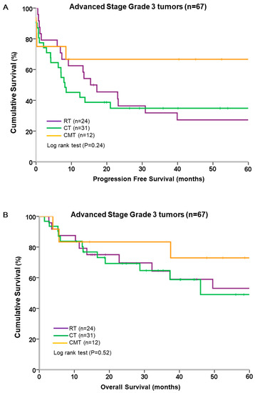 Survival of 67 patients with grade 3 tumors, stratified by different adjuvant modalities. (A) Progression-free survival; (B) overall survival.