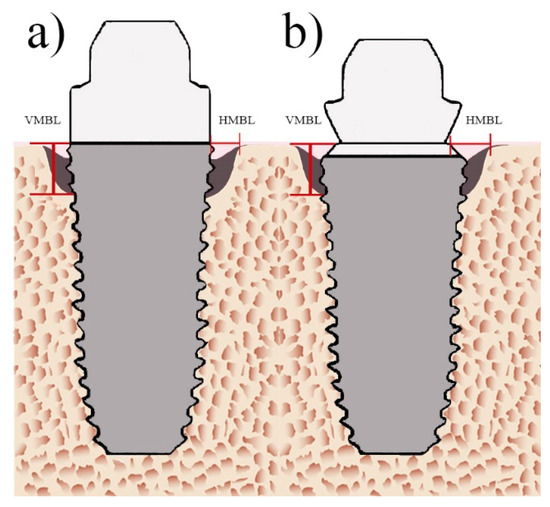 Figure 2. Radiographic measurements of platform-switched implants. (a) Platform-matched (PM) dental implants, (b) platform-switched (PS) dental implants. Vertical marginal bone loss, VMBL; horizontal marginal bone loss, HMBL.