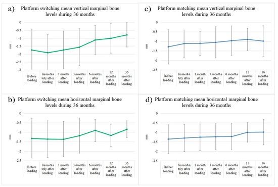 Measurements for mean vertical and horizontal marginal bone loss over the 36-month follow-up period. Variations in the mean vertical and horizontal marginal bone loss before and up to 36 months after loading. (a) The mean vertical marginal bone loss measurements over the 36-month period for PS implants. (b) The mean horizontal marginal bone loss measurements over the 36-month period for PS implants. (c) The mean vertical marginal bone loss measurements over the 36-month period for PM implants. (d) The mean horizontal marginal bone loss measurements over the 36-month period for PM implants.