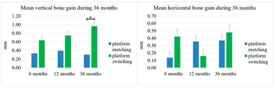Mean vertical and horizontal bone gain at 6, 12, and 36 months, reported as standard error. Asterisks (*) indicate a statistically significant difference (p < 0.05).