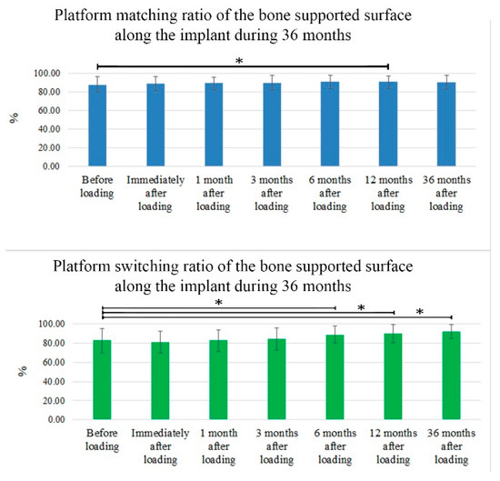 The ratios of the bone supported surface over the 36-month follow-up period are shown in Figure 6. These ratios demonstrate that the PM group averaged 88% ± 8.6% contact before loading but improved to 90% ± 7.54% at 36 months after loading (p > 0.05). Meanwhile, contact was 83% ± 12.29% in the PS group before loading, and this ratio improved to 92.40% ± 7.22% at 36 months after loading (p < 0.05) (Figure 6).