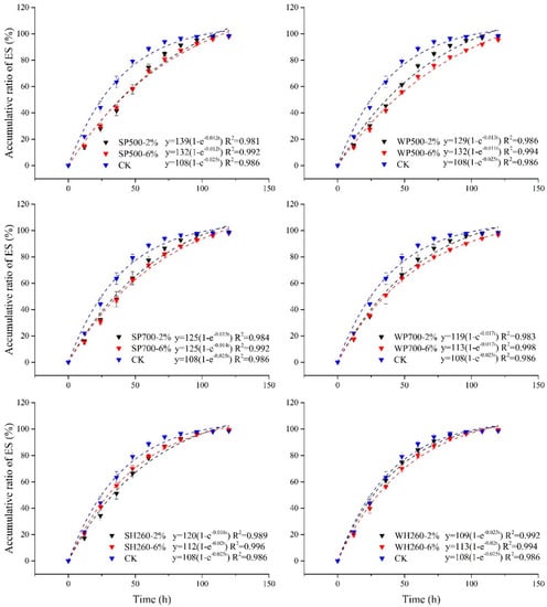 By comparison of several equations (Table 2), a first-order kinetics equation was used for fitting ES curves under different biochar application treatments and showed good fitting results (p < 0.01). Parameter b in first-order kinetics equation was used to represent the average ES rate (RA). The results showed that RA was highest under CK. RA under pyrochar application treatment was lower than that under hydrochar application, which further indicated a better ES inhibition of pyrochar (Figure 2).