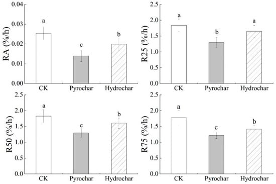 Soil evaporation rate at different times under pyrochar and hydrochar treatments. RA represents the average soil evaporation (ES) rate. R25, R50, and R75 represent ES rate when water loss reached 25%, 50%, and 75% of the total water. Different lowercase letters represent statistical differences at p < 0.05. Error bars represent standard deviations.