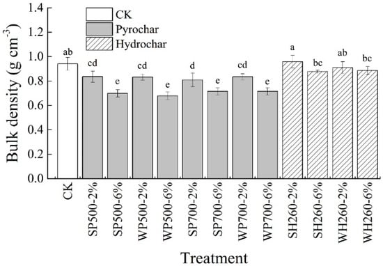 Soil bulk density under different pyrochar and hydrochar treatments after the incubation experiment. Different lowercase letters represent statistical differences at p < 0.05. Error bars represent standard deviations.