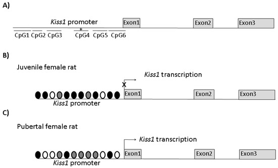 Schematic representation of the main epigenetic changes in the Kiss1 promoter occurring at puberty in female rats. Six CpG rich regions (CpG1-6) were predicted within the first 2kb 5′ upstream at the transcription start site of Kiss1; the methylation status (*) of CpG4 changes at puberty (A). The main histone modifications of the Kiss1 promoter in juvenile (B) and pubertal (C) rats. Undernutrition and overnutrition mimic conditions in (B) and (C), leading to delayed puberty or precocious puberty, respectively. Black circles, H3K27 trimethylation; white circles, H3K9/14 acethylation; gray circles, H3K4 trimethylation. The length of the Kiss1 promoter, CpG-rich regions, exons, and introns are not represented in scale. Modified from [41] and [44].