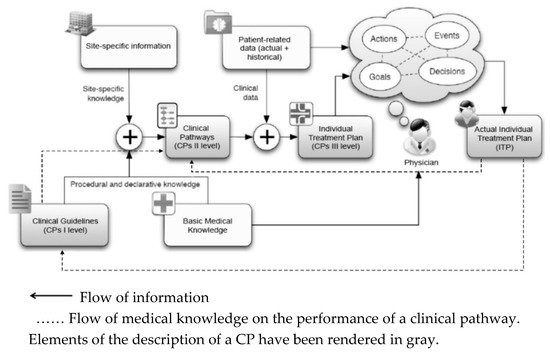 However, as the schematic diagram in Figure 2 demonstrates, the preparation of a CP in the form of an Individual Treatment Plan (ITP) cannot be detached from the broader process of distributing and updating medical knowledge. The actual beginning of the creation of a CP rests in the preparation of international or national guidelines on the treatment of specific diseases (first level CPs) by teams of experts on the basis of current medical knowledge. On this basis, with limitations in mind, with respect to available hardware and material resources, as well as the knowledge and skills of the medical staff, particular healthcare units then prepare binding clinical pathways (second level CPs). Only on this basis do physicians prepare third level CPs for individual patients, in the form of ITPs [54]. When implemented in systems supporting the work of physicians and other medical personnel (e.g., HIS or EMR), these plans allow for the presentation of the planned and performed treatment, and, first and foremost, the entry of current data on patient treatment, including ITP adaptations and upgrades, in accordance with the requirements of a specific treatment. The analysis of data collected in the course of a clinical pathway, enables constant improvements, with respect to the efficiency and quality, as well as the economic efficiency of the treatments [43,47,55,56]. As the dashed green lines on Figure 3 indicate, it also allows for the constant improvement of first and second level CPs.