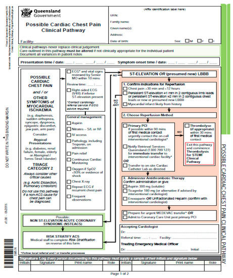 - State of Queensland. Possible Cardiac Chest Pain Clinical Pathway. Available online: https://www.health.qld.gov.au/__data/assets/pdf_file/0021/439131/sw574-chest-pain-pathway.pdf (accessed on 20 October 2018).