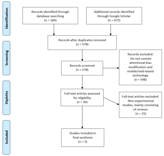 The PsycINFO, Scopus, and PubMed databases were initially used to identify peer-reviewed papers with the inclusion criteria named above, which yielded 184 results, using all search terms. Additional records were identified through Google Scholar and yielded 475 additional results. From the original search results, 81 duplicated articles were removed, and 578 abstracts were screened; 30 full text papers from peer-reviewed journals were then downloaded and assessed against the inclusion and exclusion criteria. The structured pro forma for evaluating eligibility for inclusion involved the following: recent papers that contain original experimental studies published in peer-reviewed journals after the year 2009; original research related to usage of web-based or mobile based, attentional bias modification for smokers. The focus was on recently published papers in peer-reviewed journals that fit the inclusion criteria. The main reason for the exclusion of articles was that papers were not original experimental studies. Two researchers were responsible for the evaluation and selection of the studies included in the final review. Any cases of discrepancies were considered, and a consensus was reached with the research team, which included a third researcher.