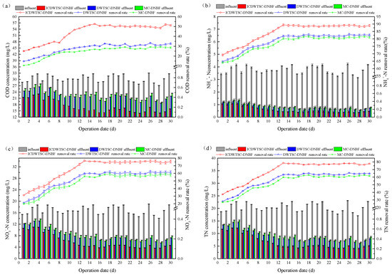 Nitrogen removal in the three systems: (a) COD; (b) NH4+-N; (c) NO3−-N; (d) TN.
