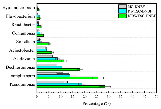 To better characterize the differences in the functional bacteria responsible for organic matter and N removal in the three DNBF systems, the microbial communities of the DNBFs were analyzed at the genus level. The abundance of the dominant genera with significant differences (p < 0 .05) is presented in Figure 2. In the ICWSC-DNBF system, the average relative abundances of Pseudomonas (28.52%, 5.71 × 106 copies/g), Simplicispira (25.57%, 5.12 × 106 copies/g), Dechloromonas (18.08%, 3.36 × 106 copies/g), Acidovorax (11.41%, 2.12 × 106 copies/g), Acinetobacter (6.28%, 1.17 × 106 copies/g), Zobellella (5.31%, 0.99 × 106 copies/g), Comamonas (2.89%, 0.54 × 106 copies/g), Rhodobacter (1.88%, 0.35 × 106 copies/g), Flavobacterium (1.35%, 0.25 × 106 copies/g) and Hyphomicrobium (0.78%, 0.14 × 106 copies/g) were obviously higher than the corresponding abundancies in the other systems. Comparisons of microbial abundancies in the ICWSC-DNBF and WSC-DNBF systems and the corresponding N removal performances indicated that iron-carbon micro-electrolysis significantly increased the abundance of denitrifying bacteria and promoted the removal of N.