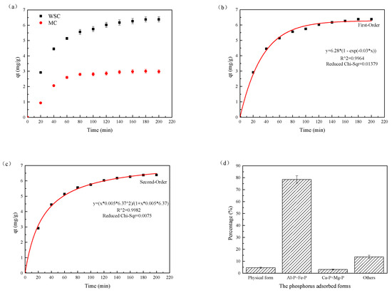 To further study the P adsorbing mechanism of WSC, two kinetic models were used to describe the adsorption process: a pseudo first-order model (Equation (2)) and a pseudo second-order model (Equation (3)). The pseudo-first-order model assumed that the adsorption rate varied with the number of unoccupied sites on the matrix [28]. The pseudo second-order model was based on chemical reactions and was affected by the mass balance and the second-order rate derivative [29]. The equations were: