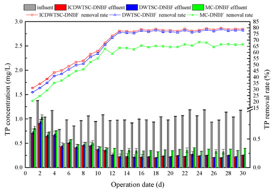 The influent concentrations of TP concentrations was 0.85–1.38 mg/L. During the first 10 days of operation, the TP removal efficiencies fluctuated (Figure 4). After 15 d of operation, the effluent TP concentration in the three systems stabilized. The average removal efficiencies of TP in ICWSC-DNBF, WSC-DNBF and MC-DNBF were 78.69%, 77.31% and 65.35%, respectively. The removal rate of TP in ICWSC-DNBF and WSC-DNBF was always higher than that in MC-DNBF. It is also noteworthy that there was little difference in TP removals by the ICWSC-DNBF and WSC-DNBF systems. This was because the removal of TP mainly depended on matrix adsorption and was not affected by iron-carbon. The specific surface area and the number of adsorption sites of WSC were higher than those of marketable ceramsite. In addition, the residual coagulants in sludge raw material had a good capacity for precipitation and removal of phosphate; therefore, the adsorption performance of WSC was slightly higher than that of marketable ceramsite, and the ICWSC-DNBF and WSC-DNBF systems achieved better P removal efficiency than MC-DNBF. Moreover, the results also demonstrated that due to the iron-carbon micro-electrolysis in ICWSC-DNBF systems, the ICWSC-DNBF system achieved slightly better removal of TP than did the WSC-DNBF system. The iron ion and phosphate produced by the electrochemical reaction precipitated, which improved the removal rate of TP in the system. Compared with that in the MC-DNBF system, the average removal amount of TP was 0.12 mg/L greater in the WSC-DNBF system and 0.14 mg/L greater in the ICWSC-DNBF. This performance was much better than the P removal achieved in the research of Zhi et al. [4].