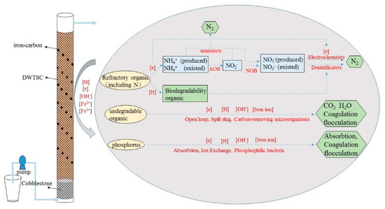 In the ICWSC-DNBF system, organic matter could be removed through physical adsorption onto the matrix and through metabolic decomposition by microorganisms (the predominant pathway). However, degradation of SE-WTP was difficult because its organic composition was mostly refractory macromolecules (such as humic acid, surfactants, synthetic agents, etc.) [31]. Due to the addition of iron-carbon, iron-carbon internal electrolysis occurred in the ICWSC-DNBF system. Simultaneously, the reducing or oxidizing effect of Fe2+ generated at the anode, together with freed electrons, effectively destroyed the carbon chains in organic contaminants until they were completely mineralized to CO2, H2O and inorganic ions [32]. Moreover, in the ICWSC-DNBF, the refractory organics (including N-containing compounds), acted as electron acceptors and were reduced to short-chain organic molecules and NH4+-N, which improved the biodegradability of SE-WTP. Furthermore, during the Fe-C micro-electrolysis oxidation or reduction process, the refractory macromolecular substances were oxidized to small intermediates or by-products, which were removed by co-precipitation and flocculation of the ferrous hydroxide and ferric hydroxide floc sludge.