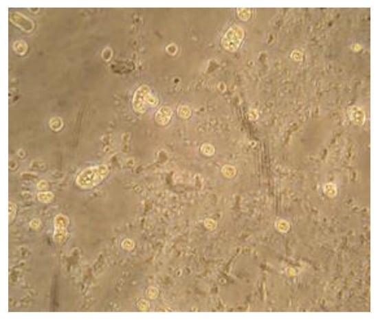 All PCR positive isolates showed bands with an approximate size of 800 bp (expected for Vermoamoeba vermiformis). The analyses unambiguously identified all samples as Vermoamoeba vermiformis (100%), the sequences showing the highest identity (99%) with those accessible in GenBank. No water sample analyzed in this study was characterized by the presence of other FLA species. Figure 2 shows Vermamoeba vermiformis from water samples from hand-pieces.