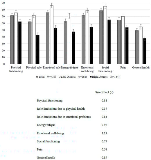 Health-related quality of life dimensions according to emotional distress status.