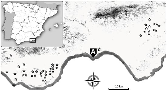 Location of 44 greenhouses surveyed for monitoring whitefly-control strategies during 2015–2018. The survey of tomato leaf curl New Delhi virus (ToLCNDV) was carried out in another 35 zucchini greenhouses in 2017 (not shown). (A) Almería city.