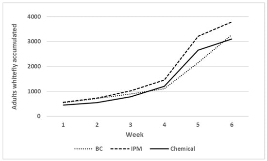 The accumulated numbers of B. tabaci adults under the biological (F = 165; d.f. = 2; p < 0.0001; R2 = 0.99) and integrated (F = 898.3, d.f. = 2, p < 0.0005; R2 = 0.99) strategy fitted a logistic function fairly well. Quantitative data analysis of B. tabaci indicated that both biological and integrated treatments were important in reducing and controlling the virus vector at the end of the crop. By contrast, the evolution of B. tabaci accumulated numbers under chemical treatment was well described by an exponential function (F = 653.9, d.f. = 1, p < 0.0000; R2 = 0.88) (Figure 4). In this case, estimated numbers of adults of B. tabaci constantly increased along the time, particularly since week 3, indicating that whitefly was not being controlled successfully by exclusively using a chemical control.