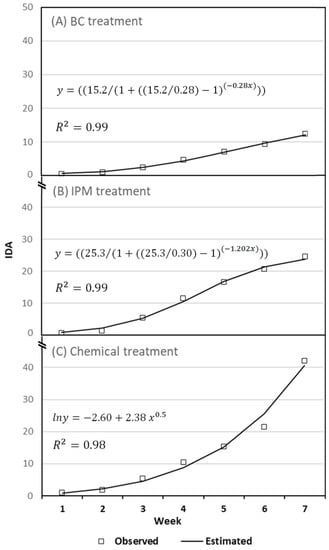 Mean insect-day accumulated values (IDA) of adults of B. tabaci under biological (A), integrated (B), and chemical (C) control strategies from experimental data (□) and predicted values (▬) by nonlinear functions. The cumulative experimental data under biological (A) and integrated (B) strategies fitted to a logistic equation and that under chemical strategy (C), to an exponential equation.
