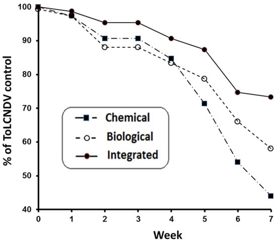 The experimental comparison of the three different whitefly control strategies, showed that the chemical strategy was the least efficient in controlling the evolution of ToLCNDV in zucchini (Table 5, Figure 5). It has also been postulated that synthetic chemicals may affect the behavior of vectors, and hence of virus transmission []. Virus acquisition and transmission by insects often occurs too fast for insecticides to control viral dispersal. Pesticide treatment has been shown to be inefficient in controlling tospoviruses transmitted by thrips [], and even enhances the dispersal of potyviruses transmitted by aphids []. This should be further studied in the case of whiteflies and the viruses they transmit.