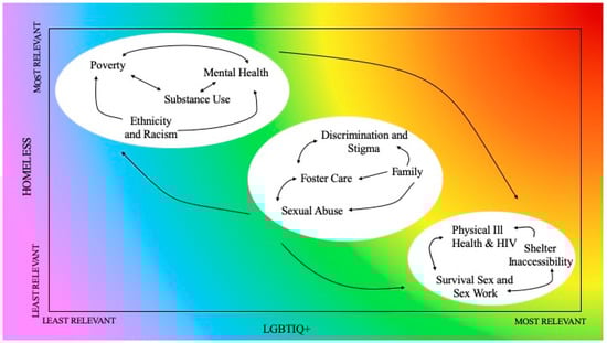This paper builds on existing LGBTIQ+ homeless literature, examining the intersections of key themes faced by both people who identify as LGBTIQ+ and people who are homeless. We propose a new way of categorising and visualising the key themes, as presented in Figure 1. This diagram places the themes in relation to each other, thus enabling them to be understood synergistically.