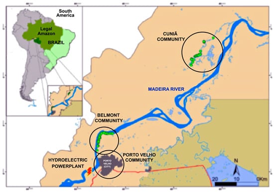 Three local communities with different lifestyles and degrees of urbanization were selected for evaluation: An urban community in the city of Porto Velho; an urban riverside community (Belmont), located 12 km from the city; and an isolated riverside community (Cuniã Extractive Reserve-RESEX), located 180 km from the city. Belmont and Cuniã are fishing communities bordering the Madeira River. At Cuniã, the community also presents nut extractivism as one of their main subsistence activities. The urban Porto Velho community is located in the urban area of Porto Velho, also near the Madeira river, presenting a not very representative fish intake (Figure 1).