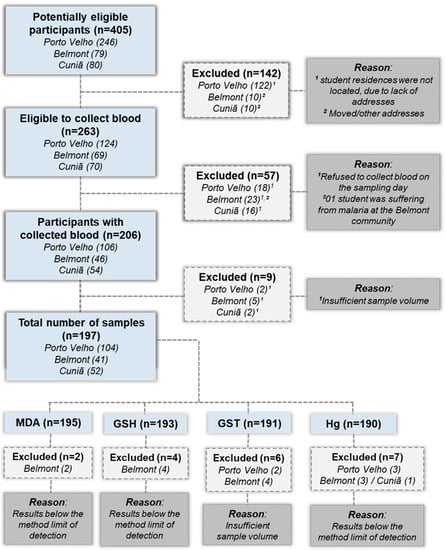 The following inclusion criteria were adopted: Children and adolescents aged 5 to 17 residing in the study areas enrolled in local schools and local residents for at least 12 months who agreed to blood collection authorized by their parents. The exclusion criteria consisted in reports of any serious neurological disease (self-reported) or refusal to participate in the study at any time and, in the case of girls, being pregnant.